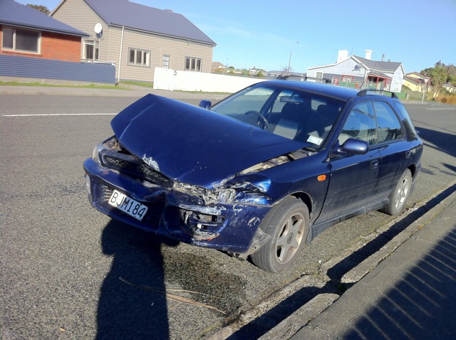 Another smashed up car, parked literally a block away from the car crash I witnessed. (Google Maps location, shows Maori meetinghouse, marae)