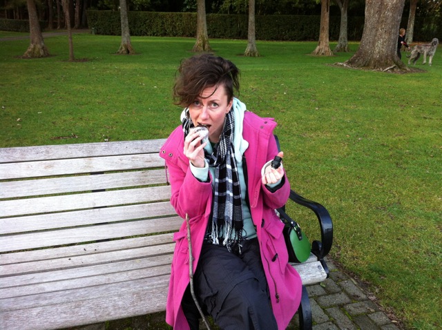 Another geocache, this one is a magnetic fake bolt on a park bench. In the background is a quote "horse dog", some kind of Great Dane (but shaggy? A giant Afghan cross?) :-) Julie is biting into a Chocolate Muesli wheel, made by Dan for our second August 2012 INVSOC potluck :-)