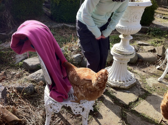 Curious Hen demonstrates why she's nicknamed Curious Hen. She calmly walked over to the two of us, and when I suggested Julie move her bag "out of the way", Ms C. Hen cut to the chase!